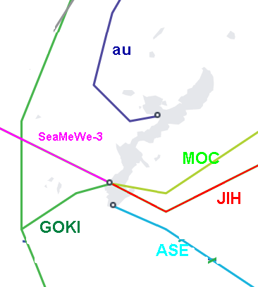 Okinawa Cellular Cable au Nago - Kagoshima 760km 4/2020 Miyazaki-Okinawa Cable (MOC) KDDI 1997 Japan Information Highway (JIH) to Miyazaki etc. KDDI 5150 km 1999 Guam Okinawa Kyushu Incheon? (GOKI) AT&T 4244km 12/2013 KitaKyushu-Okinawa-Tumon Asia Submarine-Cable Express (ASE)/Cahaya Malaysia NTT etc. 8148km 2012 Japan,HK,PI,Malaysia,Singapore SeaMeWe-3 Europe,Med.,etc, ROK,Shanghai (not Japan) 39,000 km