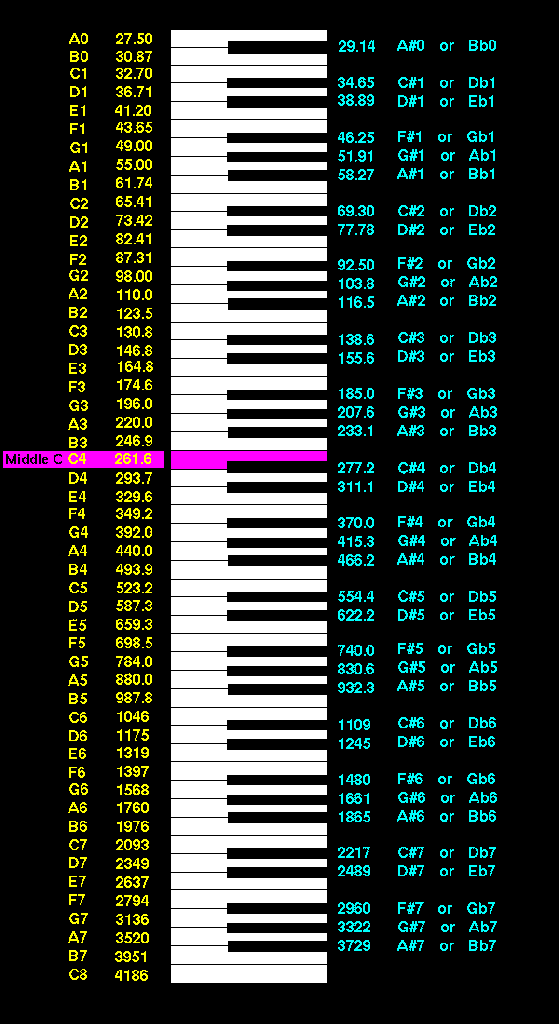 middle C. Say whaaaaat? I read it on a web site. Look at this piano tone chart to find the frequency of
