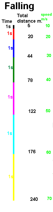 | time falling | distance fallen in meters | speed in m/s | speed in MPH |