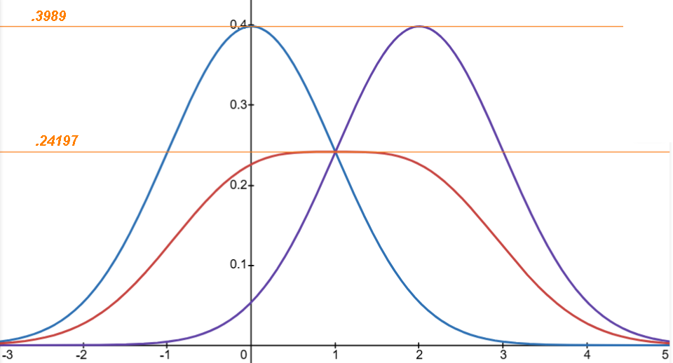 PDF(x) = \frac{1}{2}\frac{1}{\sqrt{2\pi}}e^{-\frac{\left(x-2\right)^{2}}{2}}+\frac{1}{2}\frac{1}{\sqrt{2\pi}}e^{-\frac{x^{2}}{2}}