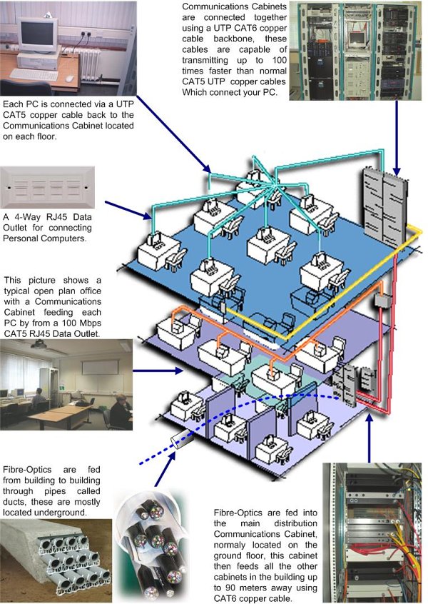 Bulk cable ("horizontal cabling") pulled from there to wiring/"telecom closet/room's"