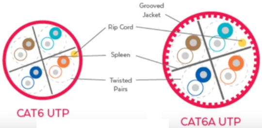 Cat 6 (2002): better for crosstalk and noise. 10Gbps@55m. 22-24