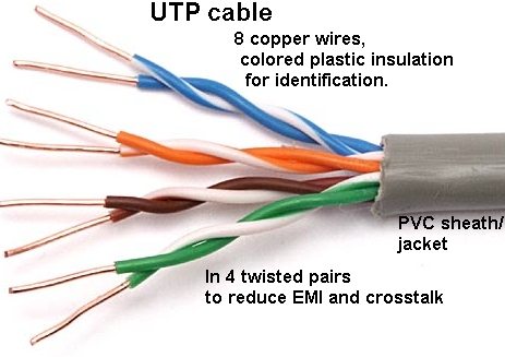 UTP (unshielded twisted pair): 4 pairs (8 wires).
