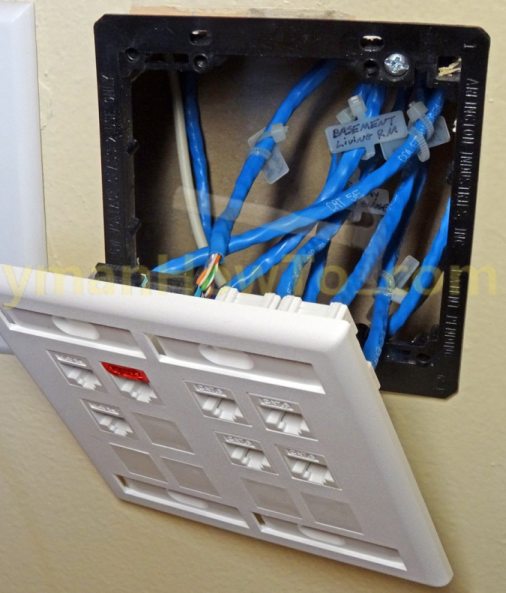 Wall/face plates installed. Cables connected to patch panel in wiring closet.