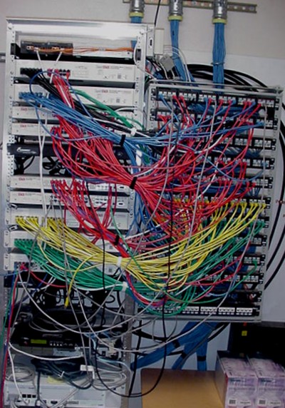 Wiring closet (IDF intermediate distribution frame): On left, switches in equipment rack.