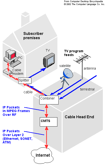 cable modem as bridge (and router). tunes to downstream channel,