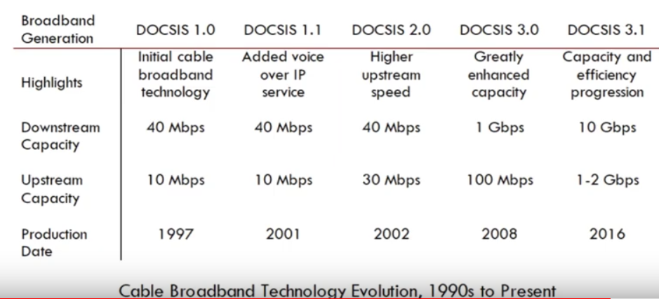 Higher capacity than DSL. Telcos counter with FTTH (fiber to the home/premises)