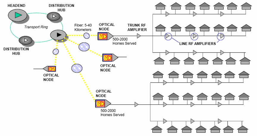 ISP/Internet--CMTS at headend--optical node--coax tree-and-branch