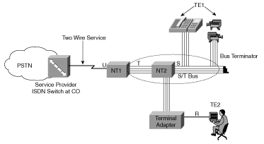 PSTN--|-- U NT1 S/T -- TA -- TE2 (non-ISDN device, e.g. PC)