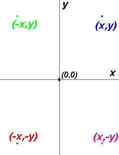 (x,y) and (-x,y) are symmetric w.r.t. the Y-axis. As are (-x,-y) and (x,-y). The x's are negatives of each other. They "jump"/"flip" across the Y axis. A horizontal line connects them. Each point is the same distance from the Y axis.