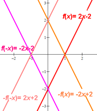 | 2x-2 | -2x-2 | -2x+2 | 2x+2 | Neither. Linear not thru origin. |
