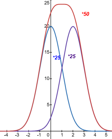 PDF(x) = \frac{1}{2}\frac{1}{\sqrt{2\pi}}e^{-\frac{\left(x-2\right)^{2}}{2}}+\frac{1}{2}\frac{1}{\sqrt{2\pi}}e^{-\frac{x^{2}}{2}}